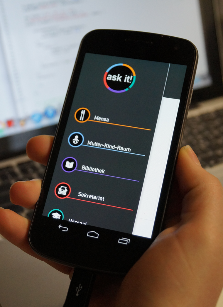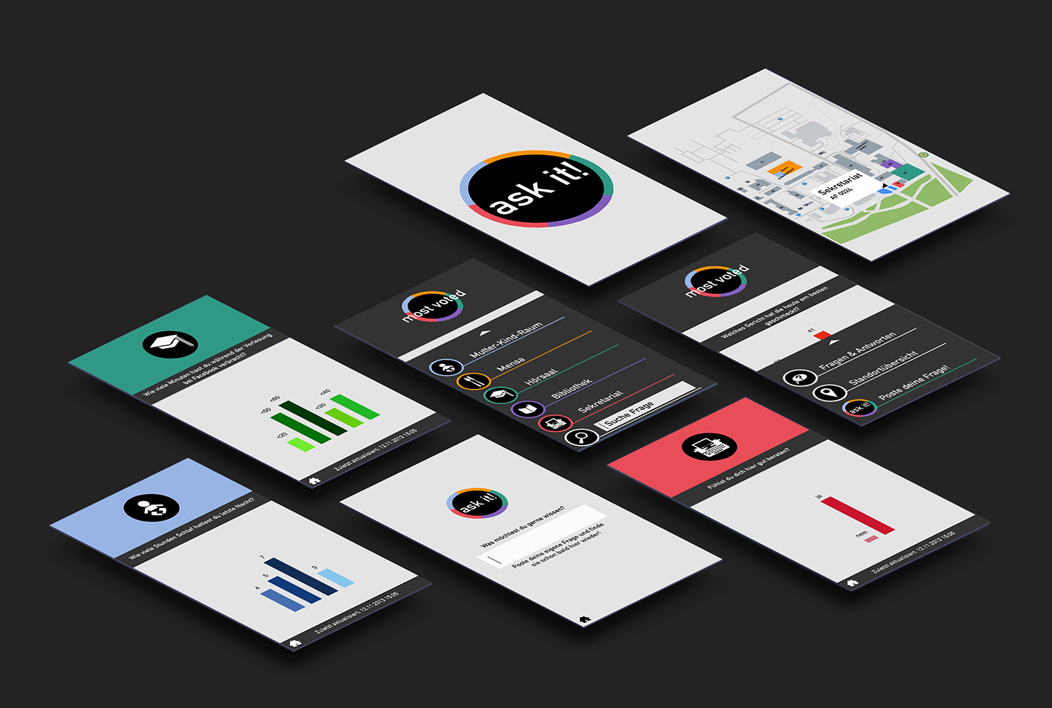 Die App zu dem Projekt Ask it! hat Zugriff auf die in der Installation gesammelten Umfragedaten und visualisiert diese in Diagrammen. Somit können unkompliziert sämtliche Daten verglichen und aufgerufen werden. Außerdem können neue Fragen für die Ask it! Umfragewand vorgeschlagen werden. Die Umsetzung fand mittels jQuery Mobile, sowie Javascript für die Sensordatenerfassung statt.