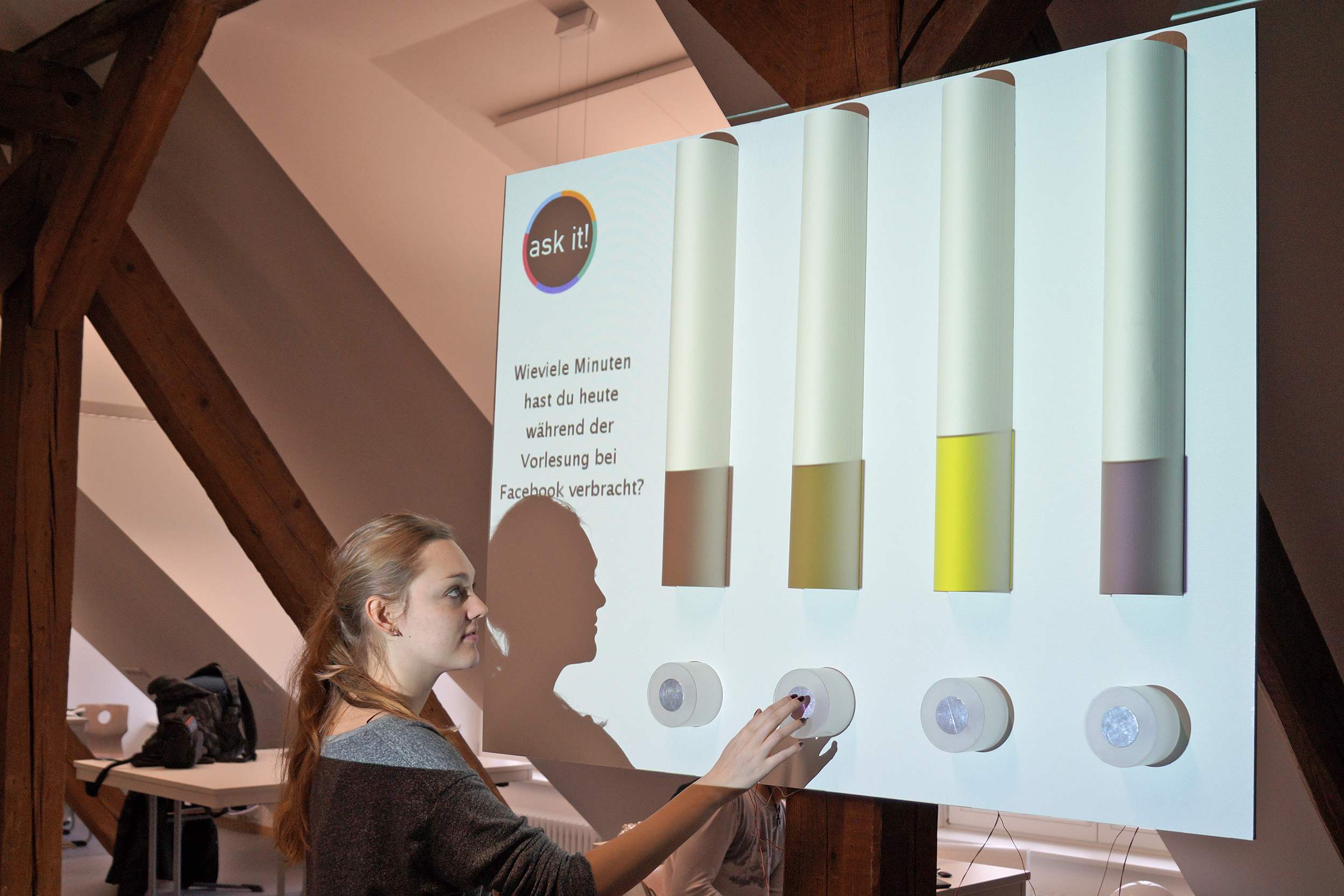 Bei Ask it! handelt es sich um eine zeitsparende und moderne Möglichkeit der Meinungsforschung mit unmittelbarer Datenvisualisierung. Aufgabenbereich des Projektes war es gesammelte Sensordaten zu verarbeiten und zu nutzen, um diese ebenfalls in einer App zu visualisieren. Der Prototyp arbeitet mit Arduino und Processing für die Datenermittlung, Verarbeitung, sowie Projection Mapping zur Visualisierung. JQuery Mobile wurde für die Erstellung der App verwendet. Eine Zusammenarbeit mit Ina Kleemann.